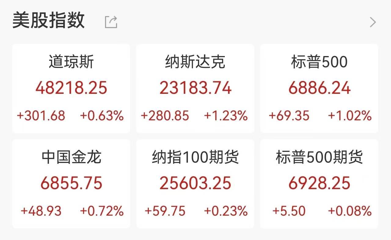 当地时刻4月13日,好意思国三大股指全线收涨,阛阓在好意思伊谈判出现新转移的乐不雅预期中强势反弹。遏抑收盘,说念琼斯工业平均指数高涨301.68点,涨幅0.63%,收于48218.25点;轮番普尔500指数高涨69.35点,涨幅1.02%,收于6886.24点;纳斯达克空洞指数高涨280.84点,涨幅1.23%,收于23183.74点。其中,标普500指数不仅复原了年内通盘跌幅,更创出自2月底地区浮松爆发以来的新高。