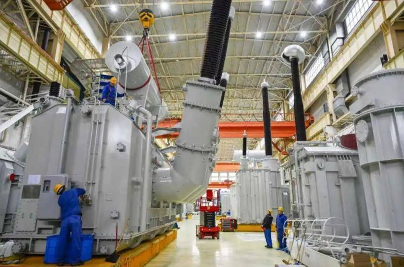 在天威保变(合肥)变压器有限公司坐蓐车间,工东说念主们进行变压器安装坐蓐功课。赵明摄