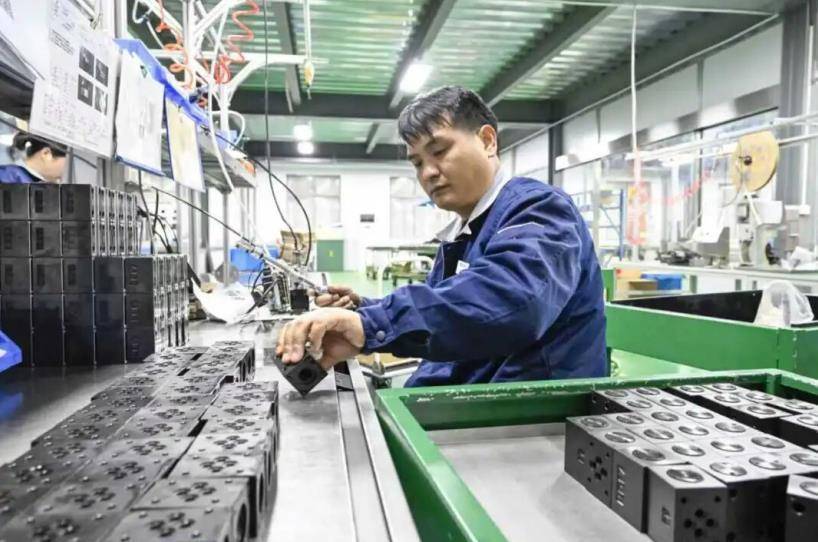 在安徽力威液压智能制造有限公司坐蓐车间,工东说念主正在加工新能源汽车电磁阀。赵明摄